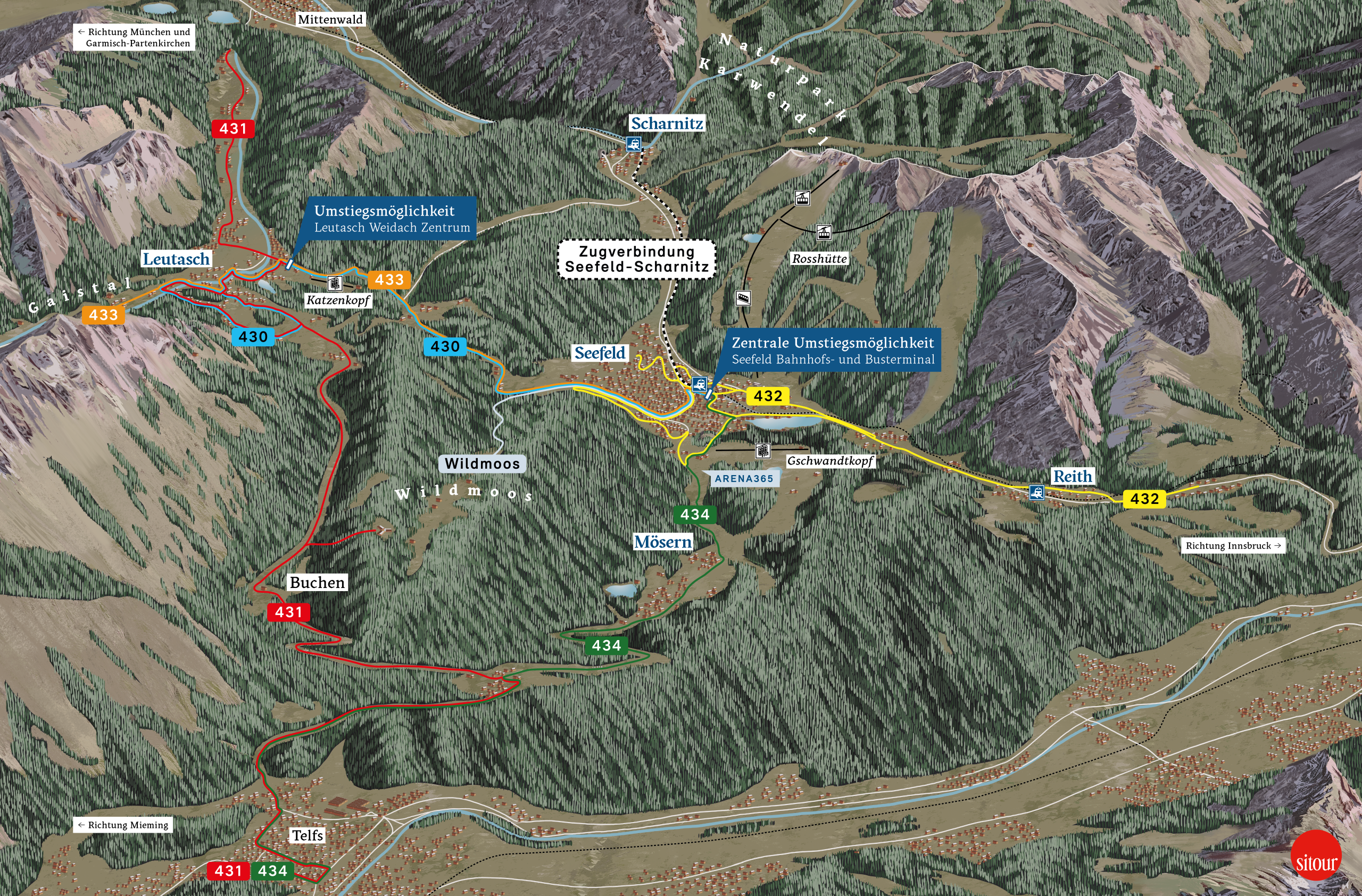 Mit den öffentlichen Verkehrsmitteln fahrt ihr zunächst zum Bahnhof Seefeld – aus Richtung Innsbruck (hier zum Scotty) oder aus Richtung Deutschland (hier zur DB) – und steigt dann in die Buslinien 432/ 432S bis zur Haltestelle „WM-Halle“, von wo es noch etwa 5 Minuten zu Fuß zur Arena365 sind. Alternativ bringt euch die Buslinie 434 zur Haltestelle „Gschwandtkopflifte“, ebenfalls nur rund 5 Gehminuten entfernt.