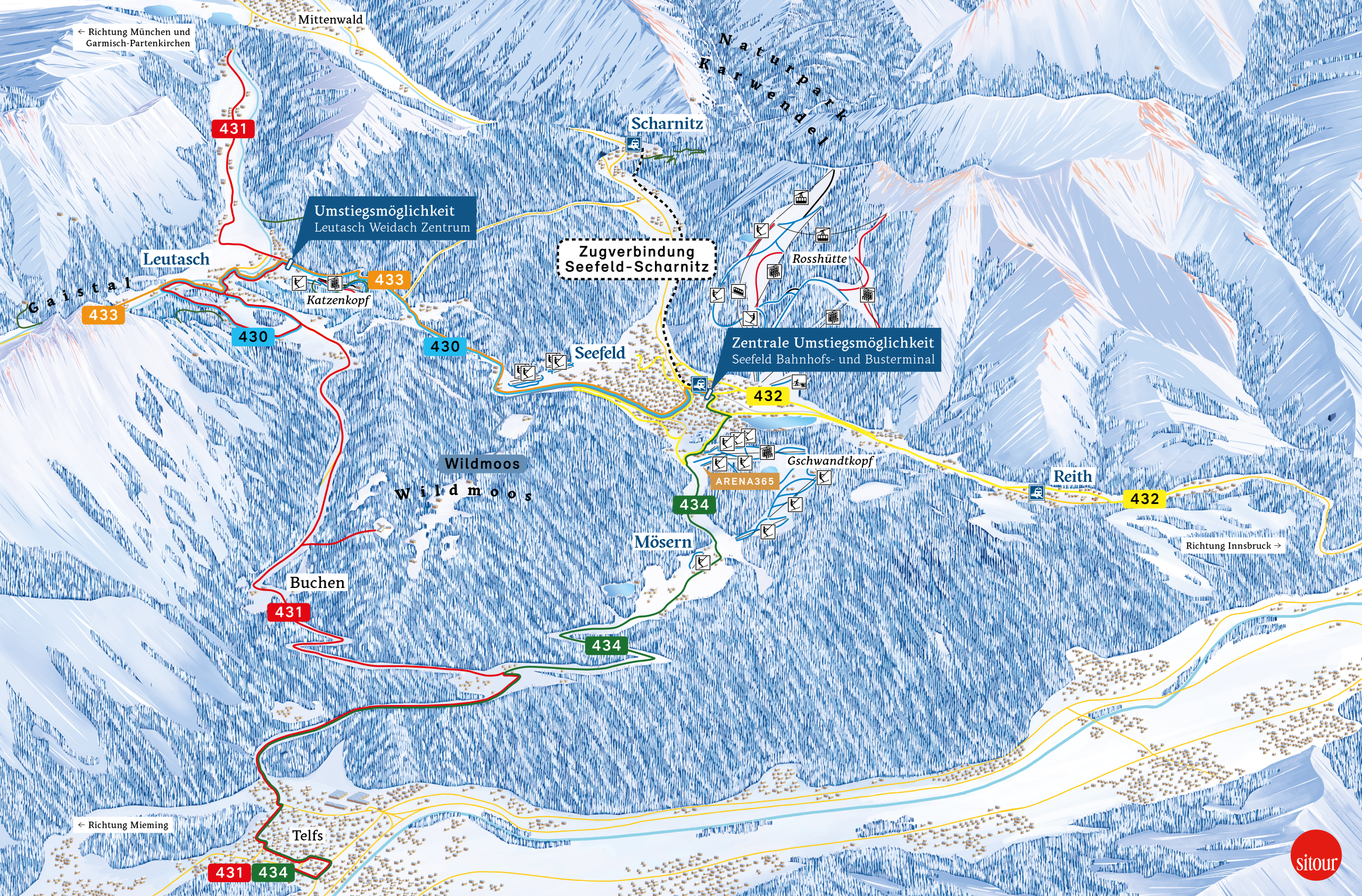 Travel by public transport to Seefeld train station – coming from Innsbruck (see ÖBB Scotty) or from Germany (see Deutsche Bahn) – and continue by bus to the “WM-Halle” stop. From there, it’s only about a 5-minute walk to the Arena.