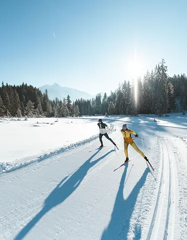 Auf Tirols Hochplateau stehen rund 245 Loipenkilometer zur Auswahl. Die Strecken verbinden alle fünf Orte der Region und bieten für jedes Niveau passende Bedingungen – von einfachen, flachen Runden bis zu anspruchsvolleren Distanzen. Präparierte Spuren, offene Plateaulage und viel Platz machen das Langlaufen hier besonders angenehm.