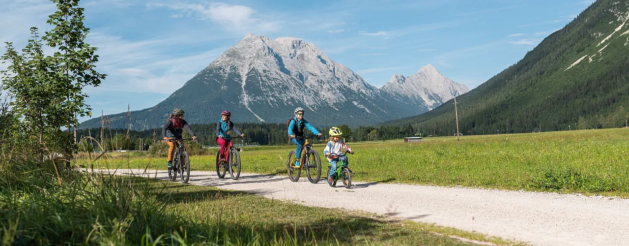 Auf vielen breiten und komfortablen Radwegen lässt sich die weitläufige Region Seefeld auch problemlos mit Laufrad, Kinderanhänger oder Kinderfahrrad erkunden: Von Scharnitz geht’s mit wenigen Steigungen durch den Naturpark Karwendel, in Leutasch führen gemütliche Bikestrecken entlang der Ache sowie ins Almenparadies Gaistal und am Familienberg Katzenkopf wartet sogar ein echter Bikepark auf die Youngsters! Wer sein Reisegepäck trotzdem gern kompakt hält, kann passendes Equipment von Radtour bis Downhill auch einfach ausleihen. Nur nicht vergessen: Echte Helden tragen Helm!