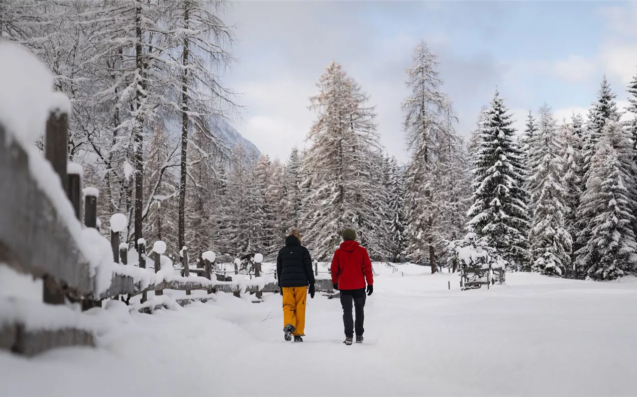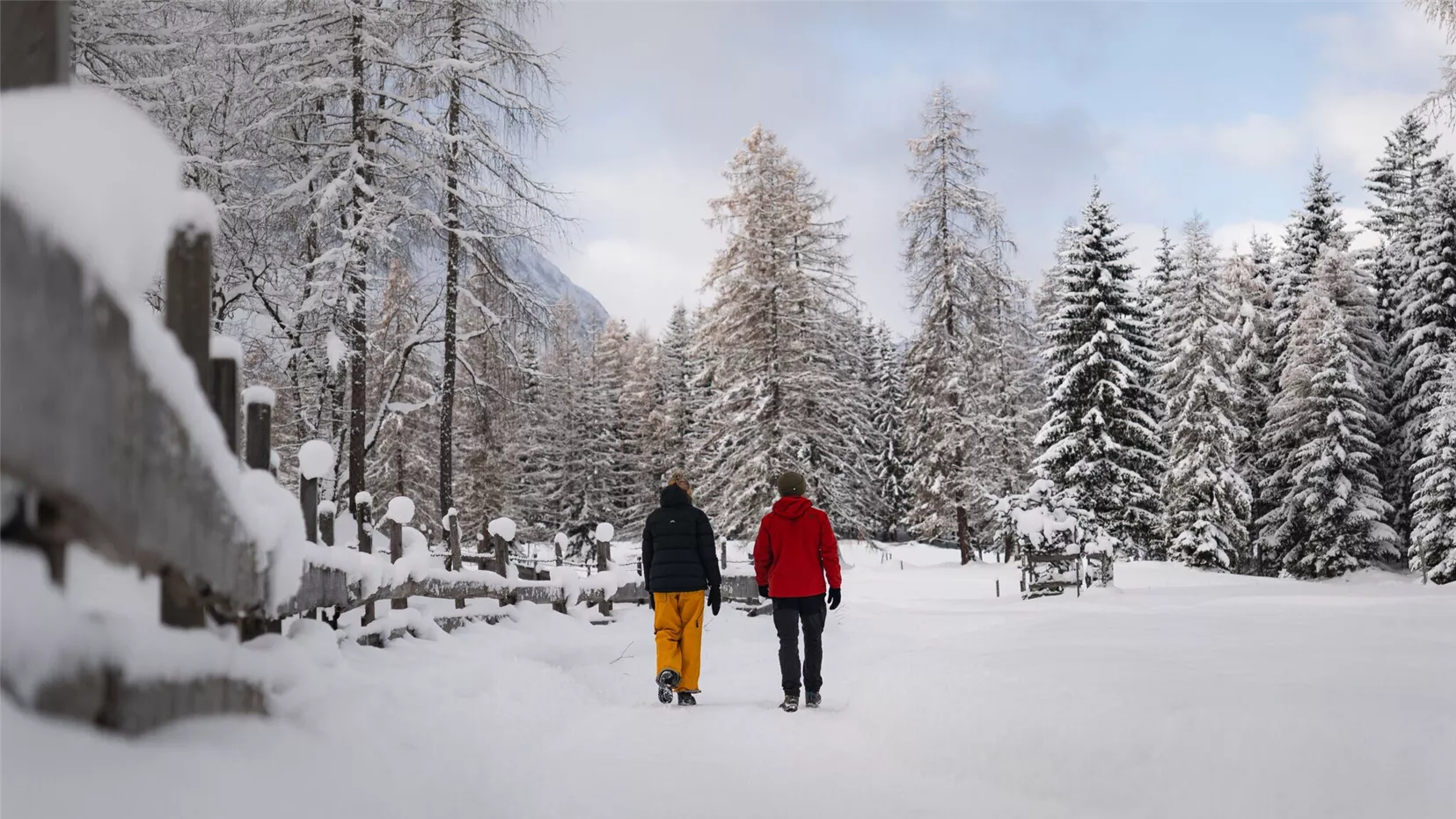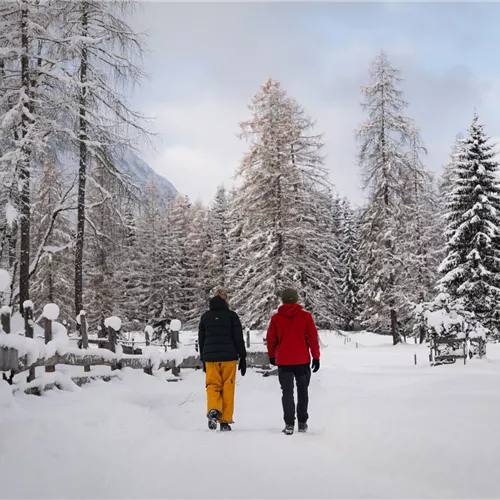 An der nächsten Kreuzung rechts halten und der Beschilderung Richtung Lottenseehütte folgen – ein kurzes Stück muss man hier auf der asphaltierten Fahrstraße gehen. An der nächsten Kreuzung links Richtung Buchen abbiegen (Wanderweg Nr. 27) und der Beschilderung Richtung Ropferstub’m folgen. (Wer will, kann vorher an der Kreuzung rechts einen Abstecher zur Lottenseehütte machen.) An der Ropferstub’m angekommen, empfiehlt sich eine Einkehr im Gasthaus und im angrenzenden Bergbauernmuseum. Hier gibt es jede Menge Wissenswertes zum Leben in den Bergen zu erfahren. Von dort aus führt der Wanderweg Nr. 24 weiter durch das Katzenloch, einen alten „Zwangspass“ von Luchsen, Wildkatzen, Wölfen und Bären, die hier vom Inntal über die Alpen durch die schneebedeckte Winterlandschaft ziehen mussten.