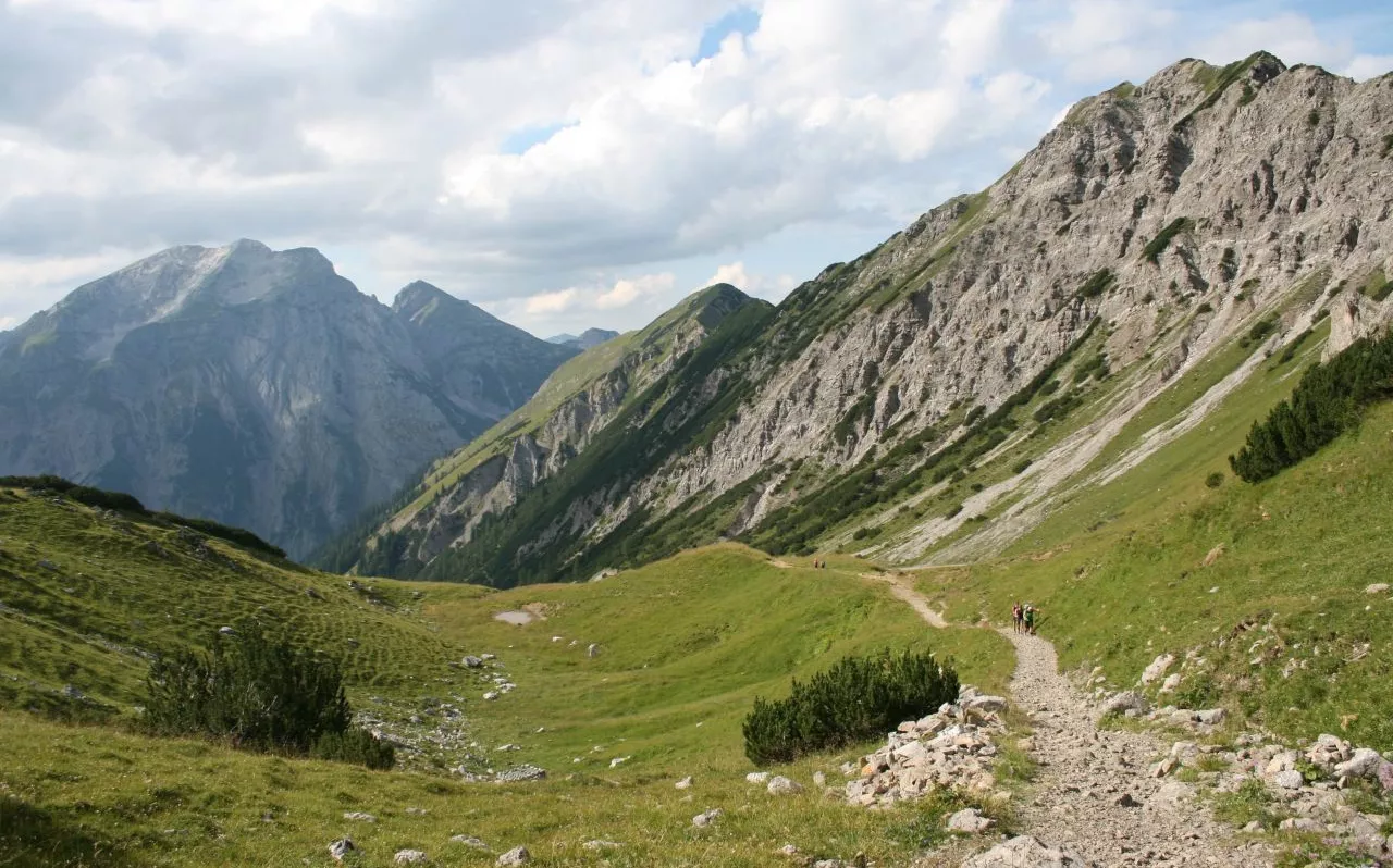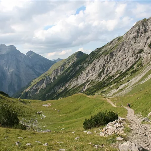 Der Forstweg verwandelt sich im lichten Wald rasch in einen Karrenweg, später in einen Steig. Der Steig leitet in der Folge sanft durch das liebliche Untere Filztal empor, eher er später ins Almgelände zieht (insgesamt praktisch stets in gleichbleibender Richtung). Wenig später mündet der Steig in einen Fahrweg. Nun auf dem Fahrweg weiter in gleichbleibender Richtung durch die Wiesen zum Hochalmsattel mit dem Jochkreuz. Anschließend auf dem Fahrweg ein paar Meter abwärts und links hinüber zum Karwendelhaus.