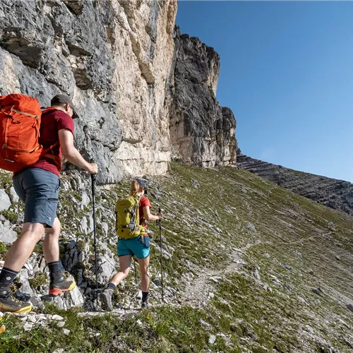 Nach der Querung führt der der Weg zunächst ein Stück abwärts, dann links mit neuer Drahtseilsicherung um einen Rücken herum und in eine Schotterrinne zum Abstieg. Dieser Rinne folgt man ca. 60 m über ein Geröllfeld weglos abwärts, links unten geht es auf dem wieder sichtbaren Weg weiter ins Hinterkar. Auch diese erste weglose Passage sollte als