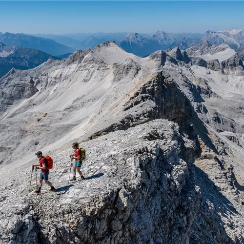 Die Rundtour startet beim Karwendelhaus. Gleich zu Beginn sind besondere Vorsicht und erhöhte Aufmerksamkeit geboten:Der Weg verläuft, teils mit Drahtseilversicherungen, auf erdigen, oft rutschigen Felsen durch die Lawinenverbauungen.