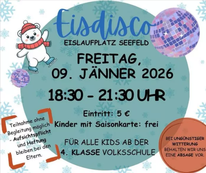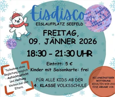 Die Eisdisco Seefeld bringt Stimmung auf den Eislaufplatz! Coole Musik, Lichteffekte und jede Menge Platz zum Drehen, Gleiten und Abtanzen auf dem Eis machen den Abend zum perfekten Start ins Wochenende.