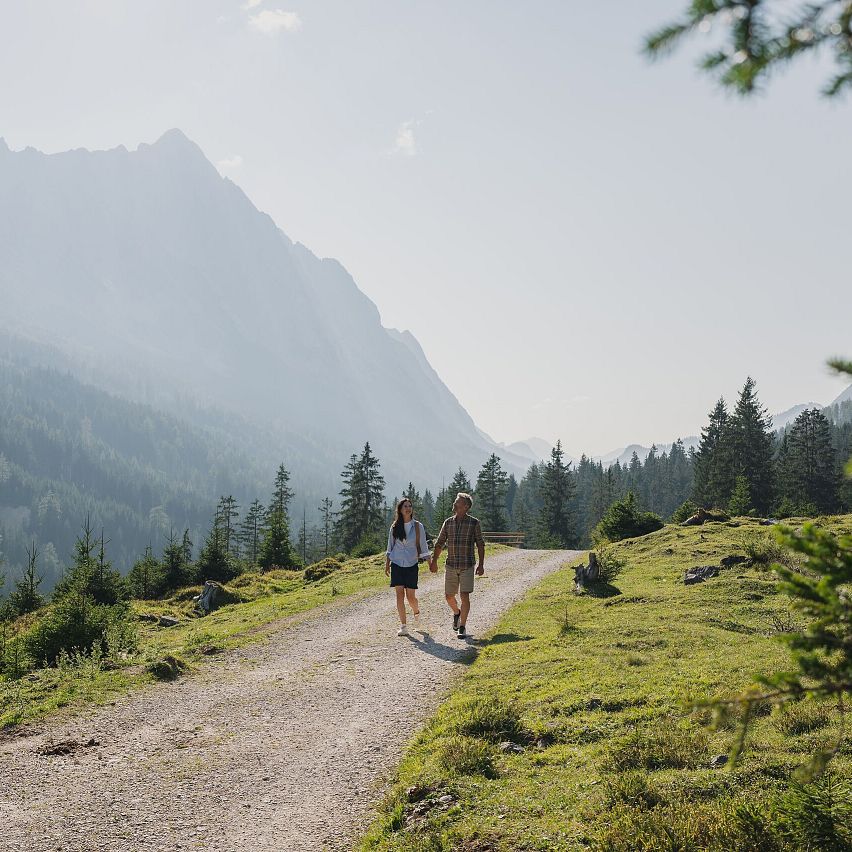 Das Leutaschtal erstreckt sich über 16 km auf etwa 1.136 m Seehöhe – eingebettet in die beeindruckende Bergwelt von Wettersteingebirge, Mieminger Kette und der markanten Hohen Munde. Diese Ortschaft der Region Seefeld begeistert mit ihrer ursprünglichen Kulturlandschaft, traditionellen Weilern und mit Lüftlmalerei verzierten Häusern. Wanderungen in Leutasch führen durch blühende Wiesen, entlang klarer Bäche oder hinein ins wildromantische Gaistal. Ob gemütliche Spaziergänge entlang der Leutascher Ache, eine familienfreundliche Tour durch die Geisterklamm, die genussvolle Hofladenrunde oder eine alpine Gipfeltour zur Arnspitze, Gehrenspitze oder Hohen Munde – die Wandervielfalt in Leutasch ist groß. Die Kombination aus Panorama, Ruhe und Ursprünglichkeit macht das Wandern in Leutasch zu einem besonderen Erlebnis in Tirol.