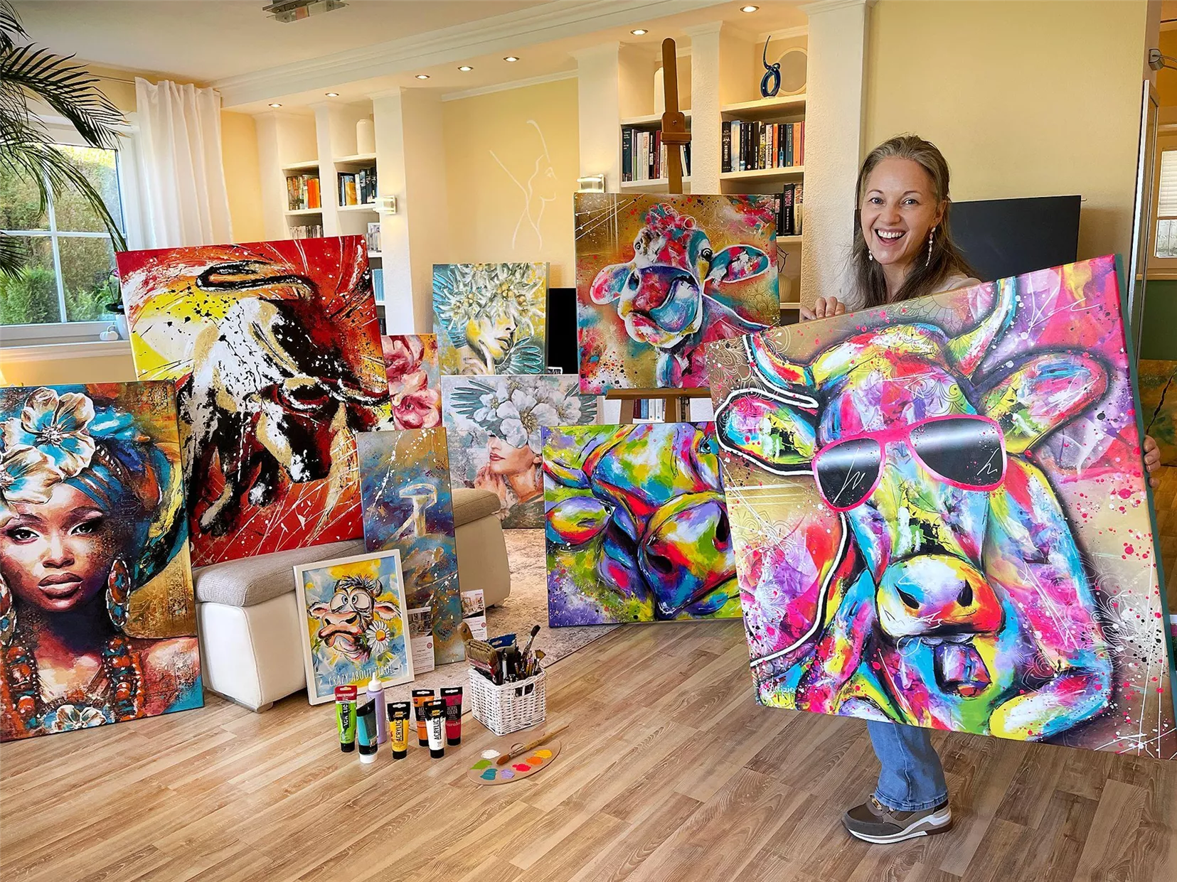 Quirky, cheerful, and with a wink – this is how the cheeky Pop Art cows and floral women's portraits of the Tyrolean artist Mag. Sabine-Delizia Egger are presented here in Seefeld.