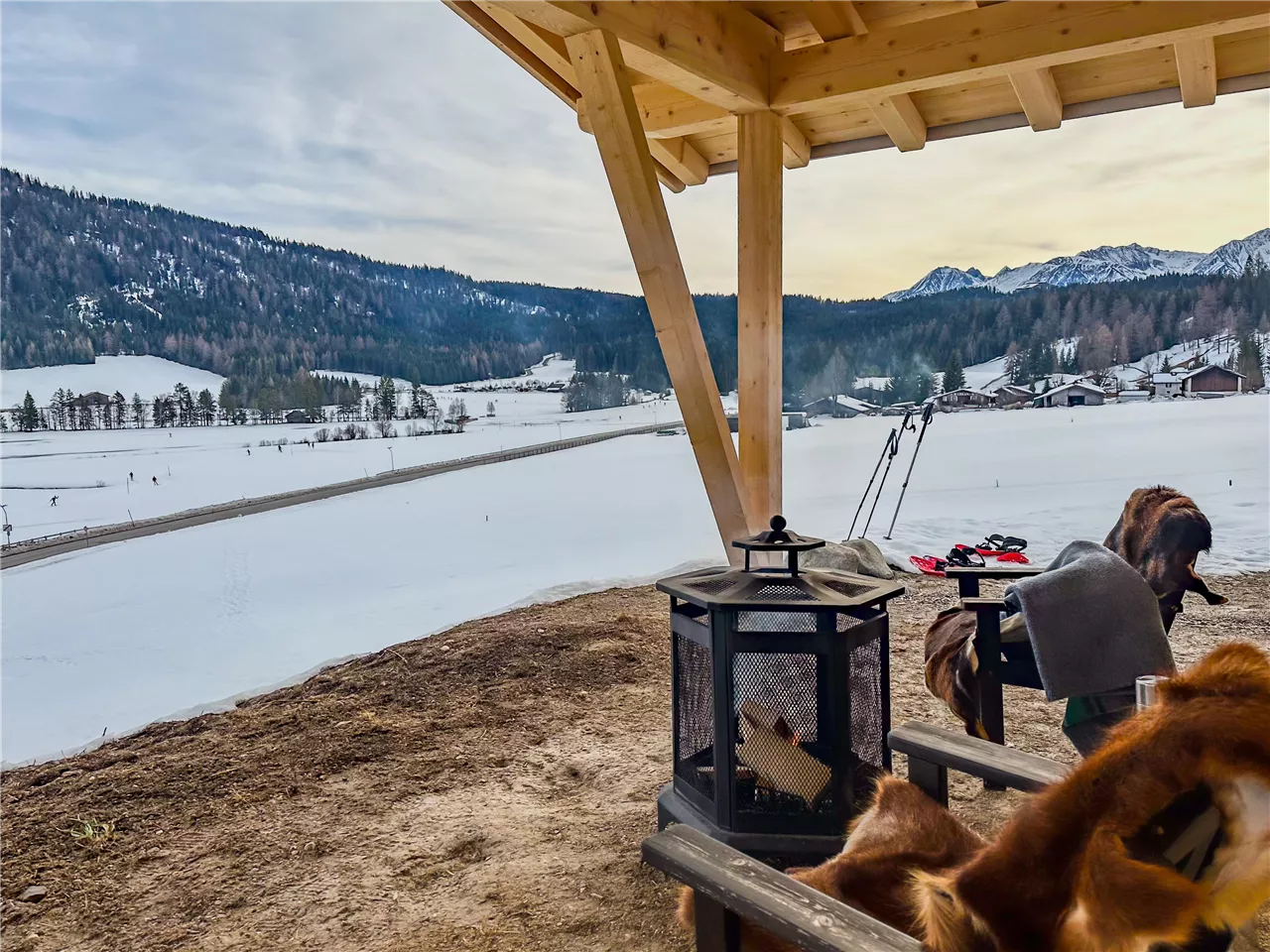 Then, full of enthusiasm and curiosity, you'll set out to explore the area - equipped with snowshoes and ski poles, as well as a backpack full of delicious regional treats from the restaurant/cafe aHORN - enjoyment at Zottlhof in the form of an extensive Marend (snack) along with homemade mulled wine or tea & a large water bottle on an exciting hike to the impressive viewing hut with a view of the Karwendel mountains, the Stubai Alps, and more... The wood/charcoal for the warming fire pit is already onsite, as well as comfortable sun loungers with cushions, real fur, and then you can enjoy the more than adequately brought delicacies in the outdoor atmosphere.