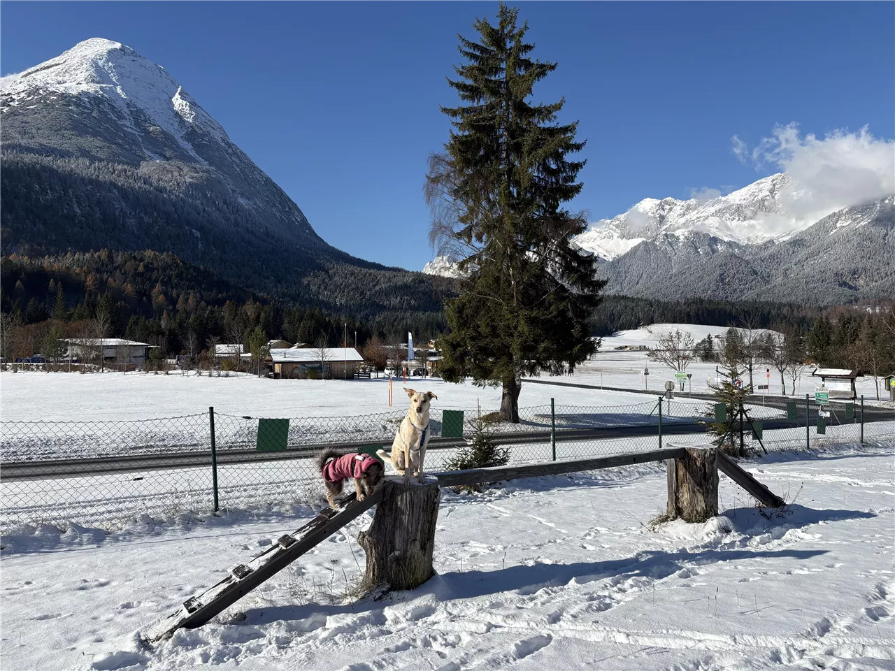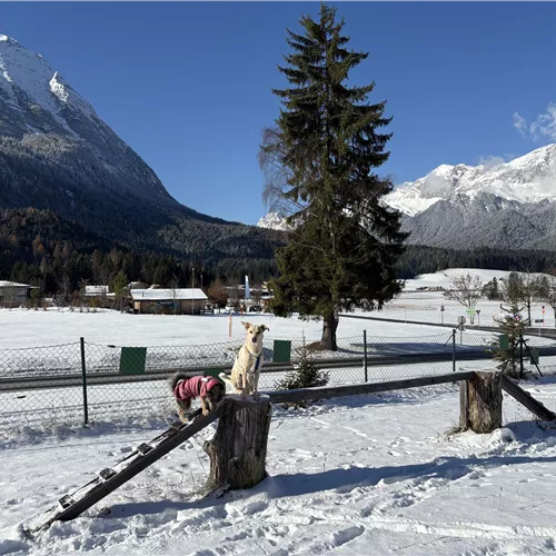 The year-round bookable Mooser Freilaufwiese offers a safe retreat and play area on an approximately 4,800 m² large, fenced grounds at the edge of the forest with mountain views, where your dog can run free, sniff, run, or simply be a dog.