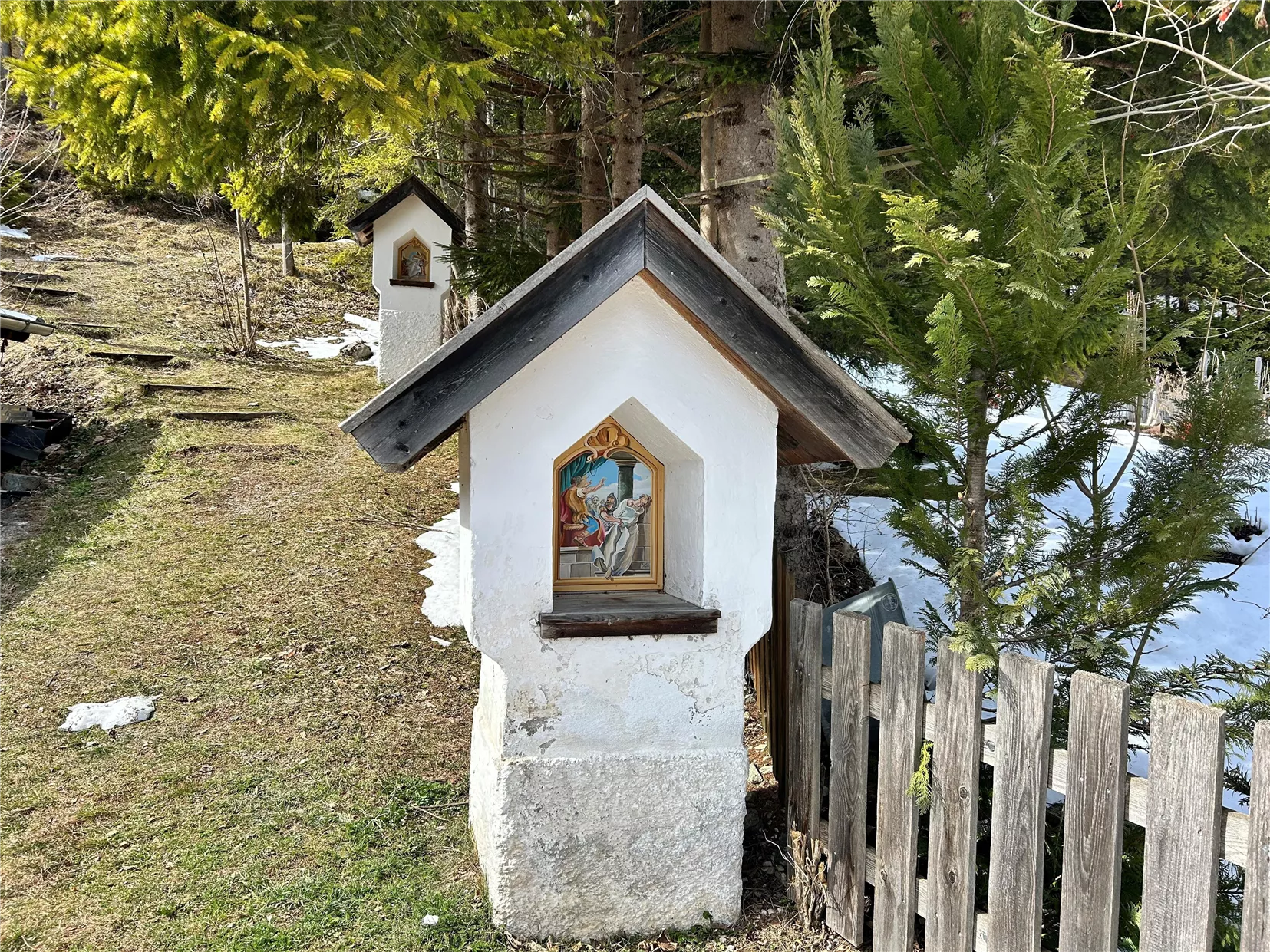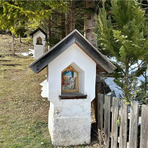 On the way up, twelve brick niche shrines with characteristic gabled roofs accompany the visitors. They date from the late 19th century, with five of these stations being renewed in 1905. Originally, the niches housed simple, naively rendered representations. In 2014, the paintings were restored by the Rietzer painter Martin Juen. The earlier depictions by the artist Axel Österreicher are now preserved as valuable testimonies in the village chronicle of Scharnitz.