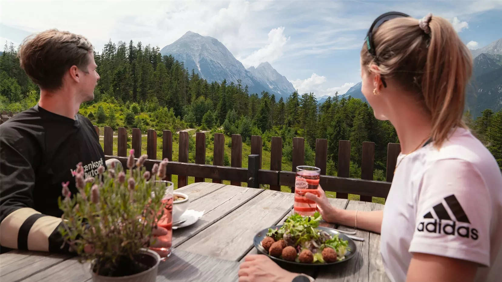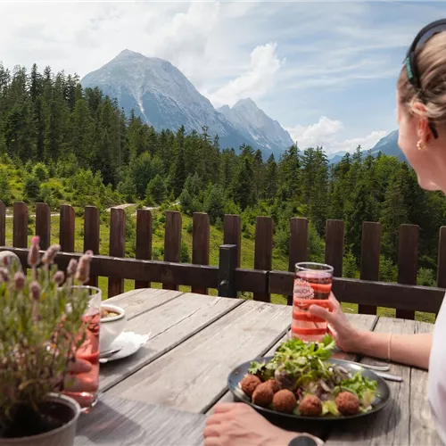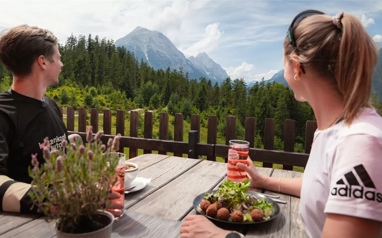 The trail continues uphill to the Katzenkopfhütte. From here, wide panoramic views open up over the Leutasch Valley, with vistas of the Wetterstein Mountains and the Hohe Munde. The