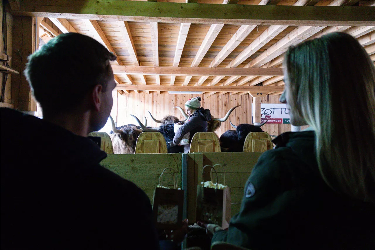 Ascoltare le brevi spiegazioni sulla agricoltura & la razza docile dei bovini delle Highlands, nonché piccole aneddoti dalla cassetta dei tesori (Zottl), rilassarsi sulle poltrone originali da cinema e non stancarsi mai delle buffe acrobazie nello Zottl-Spa, l’invito delicato a cambiare il posto del cibo e osservare il potere e il comportamento nella gerarchia degli Zottl con i loro vitelli (aprile-giugno). Godetevi i momenti con gli animali svegli e curiosi in una comoda posizione di osservazione su poltrone da cinema.