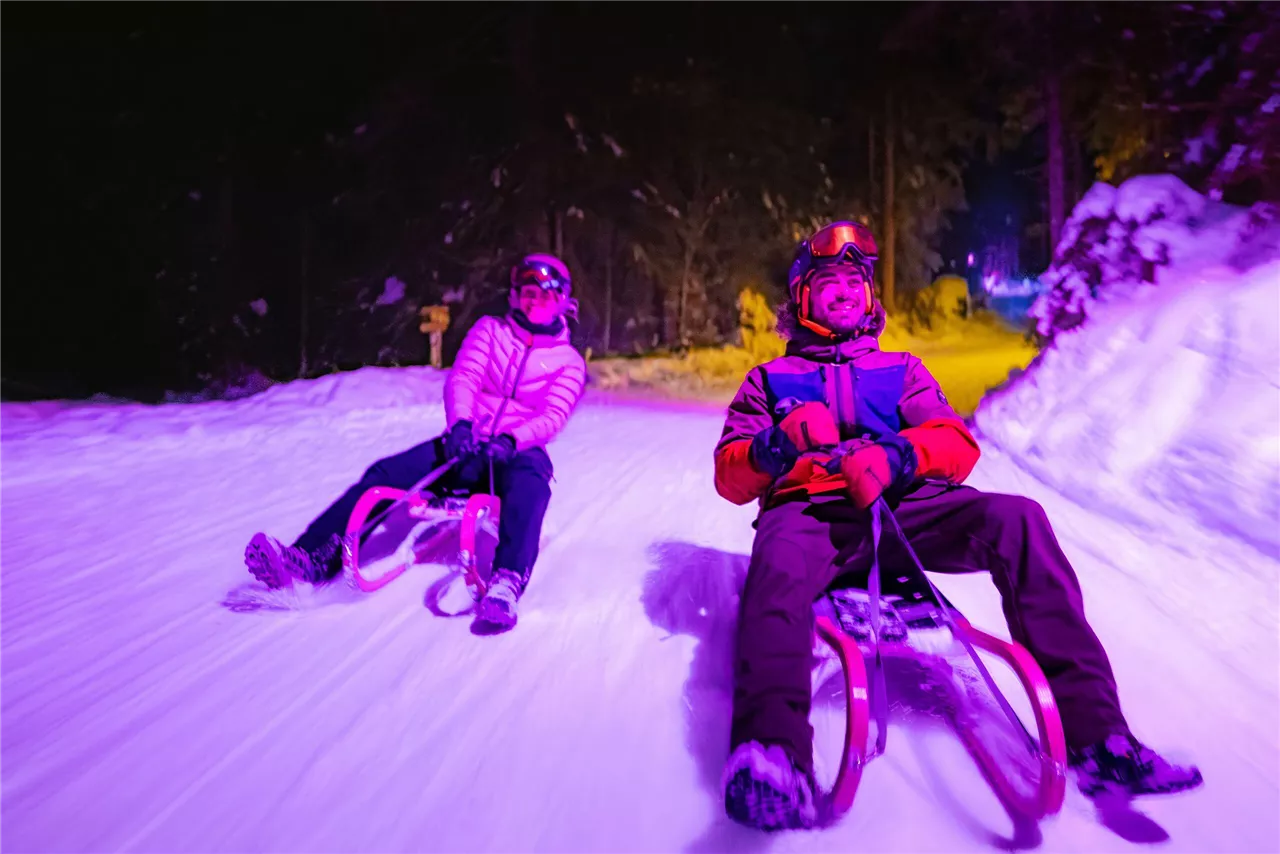 Di notte non tutte le gatte sono grigie: ogni martedì, giovedì e sabato si accende la luminosa illuminazione al Katzenkopf Leutasch - per discese scintillanti sulla pista naturale per slittini! Puoi anche semplicemente noleggiare uno slittino in loco, la seggiovia è in funzione dalle 18:00 alle 20:00, e la Katzenkopfhütte è aperta per bevande calde e succulenti piatti fino alle 22:00.