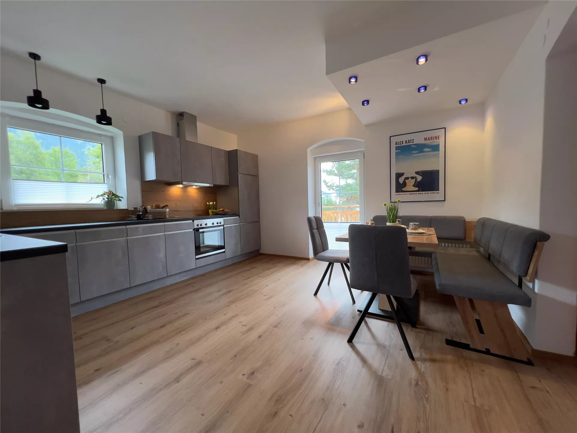 Het 110 m² grote vakantieappartement heeft een aparte ingang en bevindt zich op de 1e en 2e verdieping van ons privéhuis. Alle kamers zijn modern en stijlvol ingericht. De grote, lichte keuken met eethoek en open doorgang naar de woonkamer is het hart van het appartement. Twee zuidelijke balkons nodigen uit om te ontspannen en bieden uitzicht op de omliggende bergen en de golfbaan.