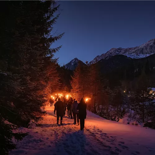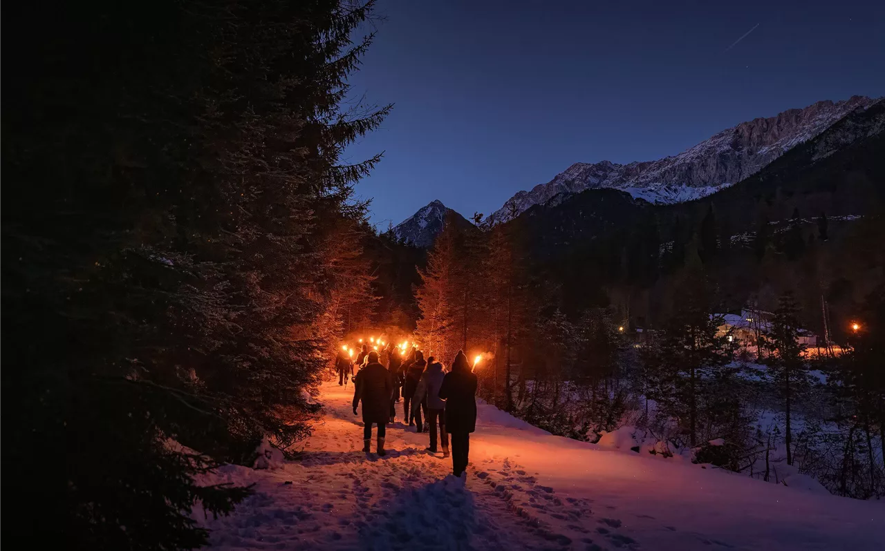 Wanneer de stille winternachten over de besneeuwde weiden en bossen vallen, fonkelt de diep onder Mösern gelegen Innvallei als een enorme kristal. In het flikkerende fakkellicht komt het indrukwekkende panorama dan in zijn meest exclusieve vorm naar voren. Doordrenkt met interessante details over Mösern, wordt de winterse nachtwandeling een romantische sneeuwwandeling van uitzonderlijke aard.